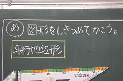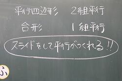 平行四辺形も台形も平行な片があることを理解しており、三角定規をスライドして平行な線を引いて平行四辺形、台形をかく子供たちでした。