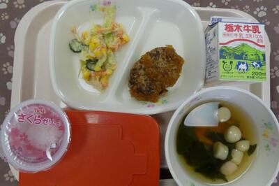今日は、「入学・進級お祝い給食」でした。ハンバーグの和風ソース、ツナと野菜のサラダ、すまし汁、ごはん、さくらゼリー、牛乳をいただきました。エネルギー635kcal、たんぱく質23.7g、脂質19.2gでした。ごちそうさまでした。
