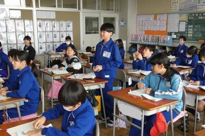前回行ったテストの振り返りを行った後、新しい単元の学習に向けて、問題解決や説明の道具として大切な比例数直線(2本の数直線を組み合わせて表したもの)について、かき方や使い方をみんなで確認していました。