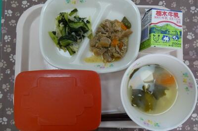 今日の給食は、野菜入り焼肉、じゃこあえ、玉ねぎとわかめのみそ汁、ごはん、牛乳でした。エネルギー665kcal、たんぱく質26.5g、脂質23.1gでした。ごちそうさまでした。