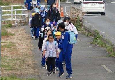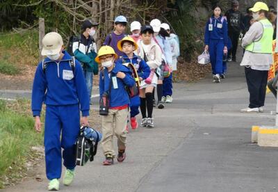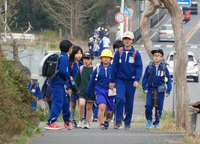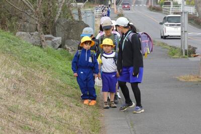 写真は、お迎えにきた登校班長さんと一緒に歩く1年生の皆さんです。