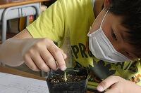 4年生の理科ではヒョウタンの成長を観察しています。種まきをして双葉が出てきました。