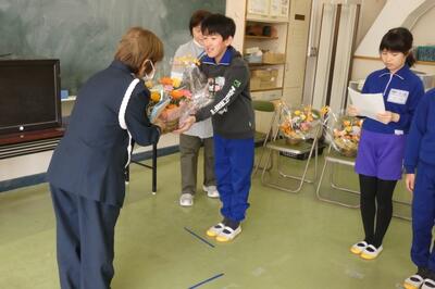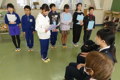 4名の交通指導員さんに感謝の気持ちを伝える6年生の代表児童。