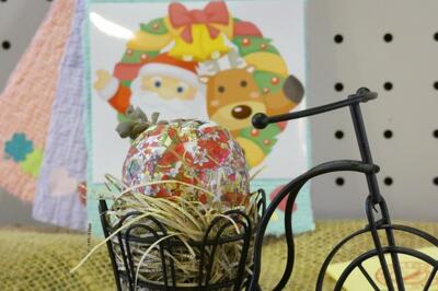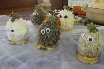 子供たちが、卵の殻に一生懸命模様を貼って、ニスを縫って仕上げていました。可愛らしい鉢になりました。トナカイさんもうれしそう!