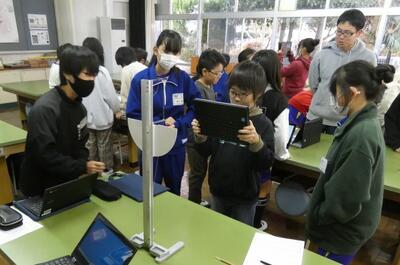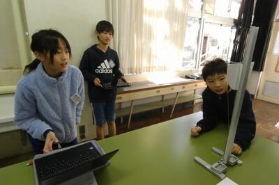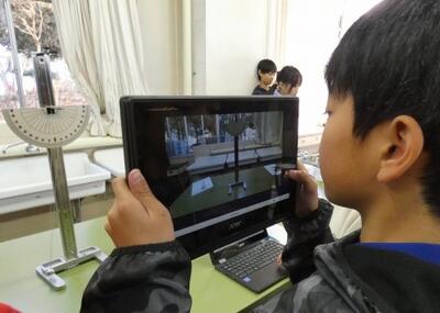 振り子の動き、振れる回数と経過時間を、タブレットパソコンで記録していました。