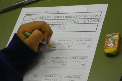 振り子が1往復する時間は、1.3~1.4秒という班が多かったようでした。次の時間に、おもりを持ち上げる角度を、20度、30度と高くするそうです。それに伴って、何か変わるのでしょうか。次の実験も楽しみです。