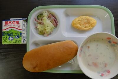 今日の給食は、トマトオムレツ、ハムと野菜のサラダ、クラムチャウダー、はちみつパン、牛乳でした。エネルギー703kcal、たんぱく質28.1g、脂質26.9gでした。ごちそうさまでした。