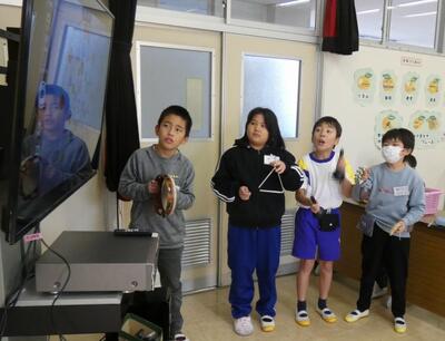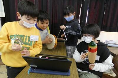 子供たちはグループごとに、カスタネットやタンブリン、トライアングル、マラカス、ギロ、カバサなどを分担して使って、パソコン画面のリズム図を見ながらリズム打ちをしました。(イメージとしては、ちょうど和太鼓リズムゲーム「太鼓の達人」のような感じです。やらせてもらいましたが、リズムにのってみんなで合わせて打つのは、慣れるまで結構難しかったです)