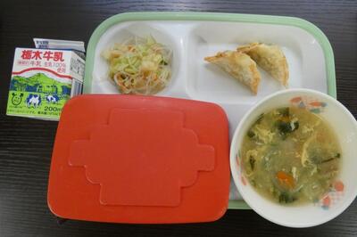 今日の給食は、ぎょうざの甘酢あんかけ、春雨サラダ、中華風コーンスープ、ごはん、牛乳でした。エネルギー642kcal、たんぱく質19.7g、脂質19.9gでした。ごちそうさまでした。