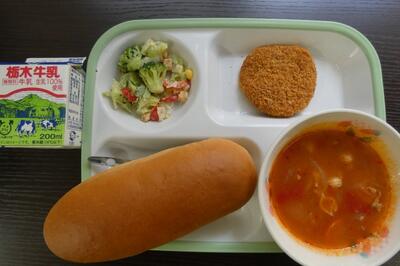 今日の給食は、焼きメンチカツ、シーザーサラダ、ミネストローネ、ミルクコッペパン、牛乳でした。エネルギー692kcal、たんぱく質24.9g、脂質27.5gでした。ごちそうさまでした。