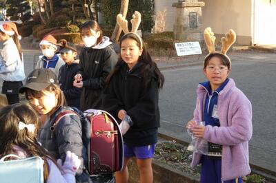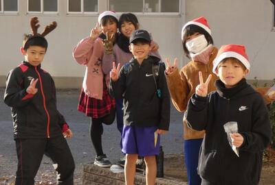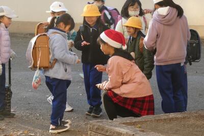 昇降口で、あいさつ運動を展開する運営委員さんたち。あいさつが上手な西っ子に、クリスマスのシールをプレゼント。
