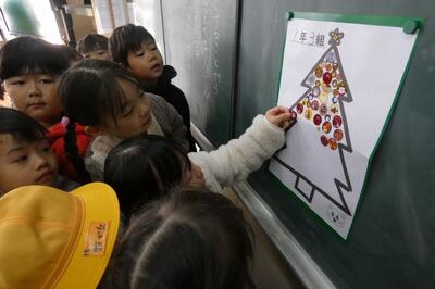 もらったシールは、自分の教室のクリスマスツリーに貼ります。