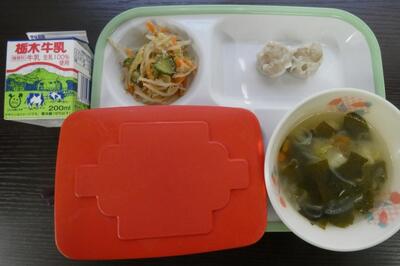 今日の給食は、肉しゅうまい、ごま酢あえ、豆腐とわかめのスープ、ごはん、牛乳でした。エネルギー626kcal、たんぱく質20.7g、脂質21.8gでした。ごちそうさまでした。
