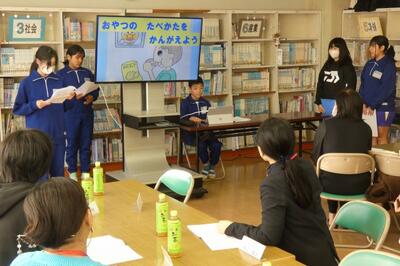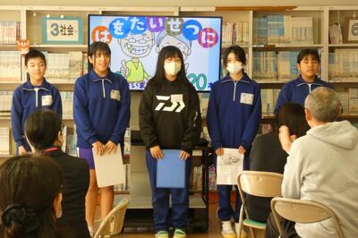 下の写真は、テーマに関する調査研究の発表をしている児童会健康委員の皆さんです。すばらしい発表をありがとう! ご苦労さまでした!