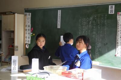 子供たちは、児童会運営委員の司会進行の下、問題場面の原因や、どうすれば良かったかなどについて、熱心に意見を交わしていました。