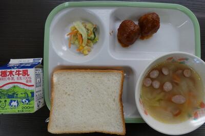 今日の給食は、肉団子トマトソース、コールスローサラダ、ウインナーと野菜のスープ、食パン、チョコ大豆、牛乳でした。エネルギー662kcal、たんぱく質25.7g、脂質27.6gでした。ごちそうさまでした。