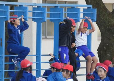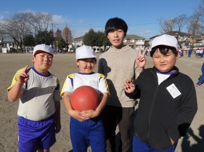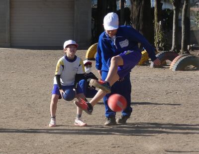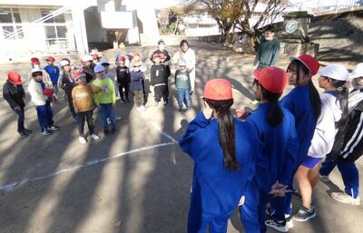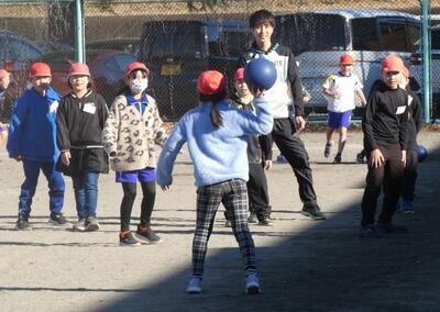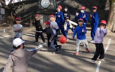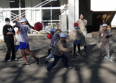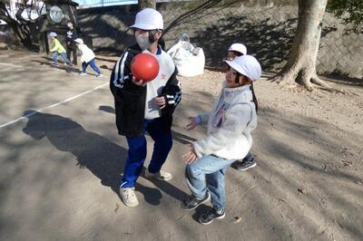 南校庭にやってきました。1年1組の子供たちが、6年生との交流の一環で、ドッジボールを楽しんでいました。