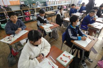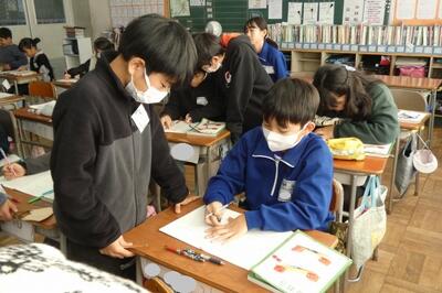 6年1組の図画工作の授業におジャマしました。木版画の下絵を一生懸命に描いていました。