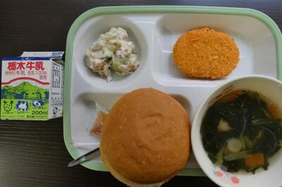 今日の給食は、野菜コロッケ・ソース、ツナサラダ、肉団子スープ、丸パン、牛乳でした。エネルギー652kcal、たんぱく質22.5g、脂質27.2gでした。ごちそうさまでした。
