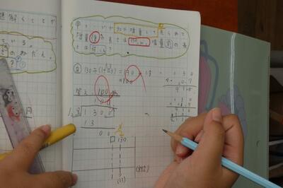 子供たちは、3つの数量の関係を図に表したり、みんなで「ひきわりなっとう」と呼んでいる公式の活用を考えたり、友達のノートや言葉をヒントにしたりして、一生懸命に課題と向き合っていました。