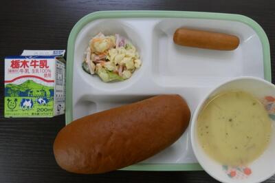 今日の給食は、フランクフルト、マカロニサラダ、コーンポタージュ、黒パン、牛乳でした。エネルギー701kcal、たんぱく質26.2g、脂質27.7gでした。ごちそうさまでした。