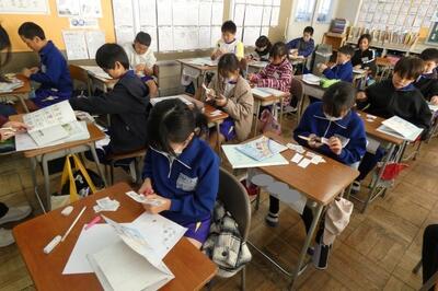 次は厚生委員会です。集まったベルマークの整理や仕分け、使用済み郵便切手の回収と整理をしていました。けっこう細かい作業で驚きました。また、先日行った共同募金のお礼状を書く児童もいました。