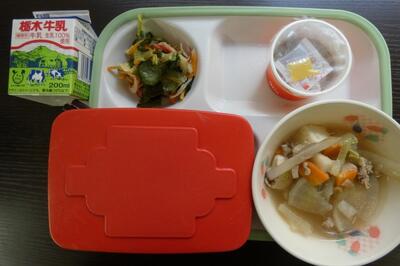今日の給食は、納豆、海藻とかにかまのサラダ、けんちん汁、ごはん、牛乳でした。エネルギー605kcal、たんぱく質23.7g、脂質20.0gでした。ごちそうさまでした。
