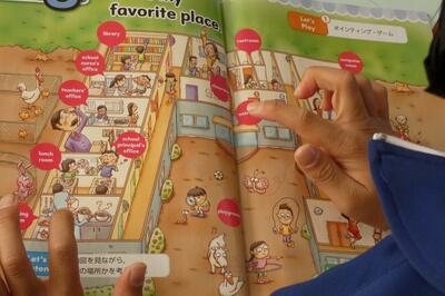 今日の学習は「私の好きな場所」です。学校の中にあるいろいろな部屋や施設の名前を、英語を使って言ってみました。次に、音楽に合わせてリズミカルに発音しました。