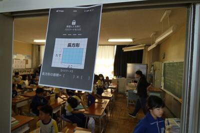 子供たちは、これまで、長方形の面積の求め方や、1㎡=10000c㎡ などを学んでいます。それらを基にこの時間は、「縦50cm、横2mの長方形」のような、辺の長さの単位が異なる長方形の面積の求め方を考えました。答えもc㎡と㎡とで出しました。