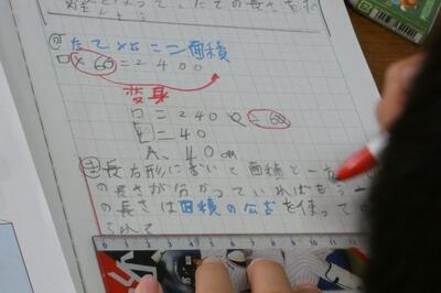 最後に、発展的な課題として、「横の長さ60cm、面積2400c㎡の長方形の縦の長さは何cm?」のような問題にチャレンジしていました。