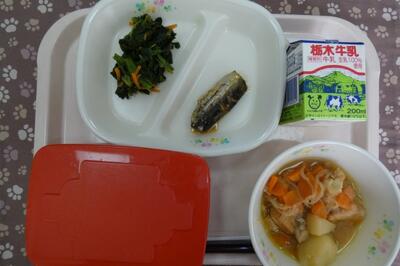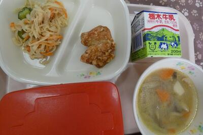 今日の給食は、とりのから揚げ、切干大根のごま酢あえ、いものこ汁、ごはん、牛乳でした。エネルギー687kcal、たんぱく質28.7g、脂質22.9gでした。ごちそうさまでした。