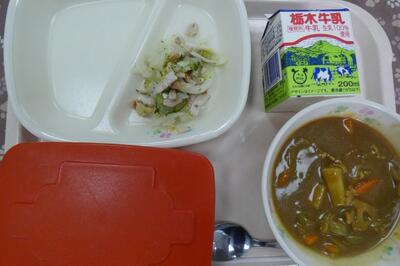今日の給食は、野菜とハムのマリネ、根菜のカレー、ごはん、牛乳でした。エネルギー600kcal、たんぱく質19.7g、脂質18.6gでした。ごちそうさまでした。