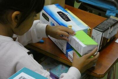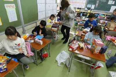 1年4組の図工の時間におジャマしました。空き箱を使って自分が作りたいものを制作する最後の時間でした。