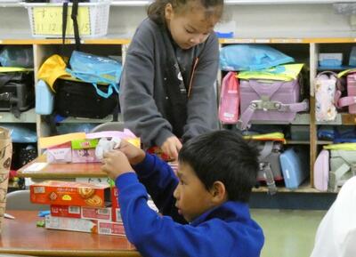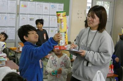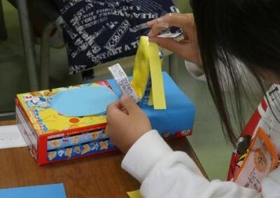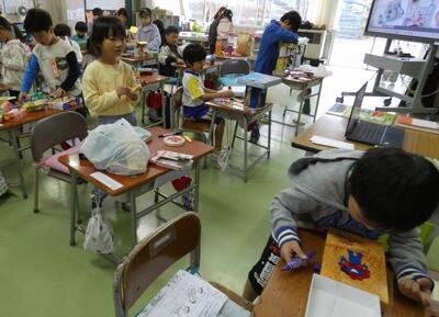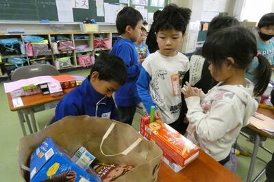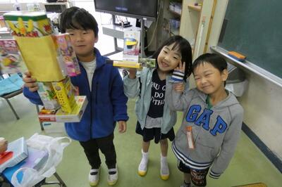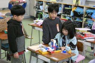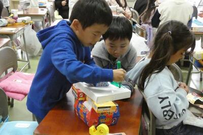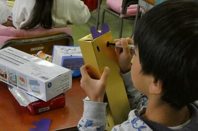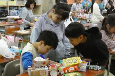 子供たちは、用意した空き箱の大きさや形や色などを生かしながら、動物やロボット、乗り物などを思い思いに作っていました。