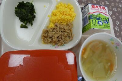 今日の給食は、三色ごはん(とりそぼろ・卵そぼろ・ほうれん草)、さつまいも汁、牛乳でした。エネルギー639kcal、たんぱく質29.3g、脂質18.8gでした。ごちそうさまでした。