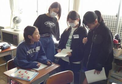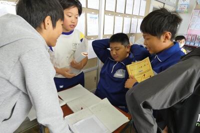 写真は、友達が発したセリフを聞いて、どの場面かを当てているところです。