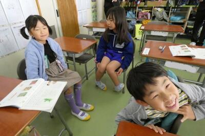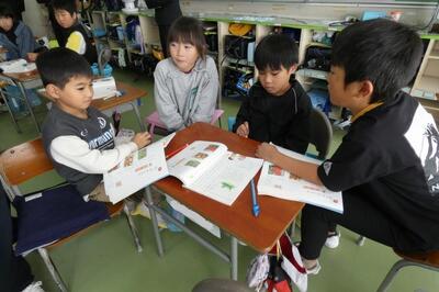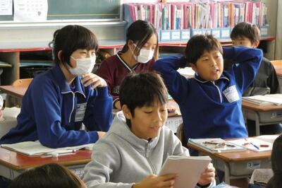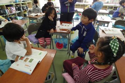 子供たちは、どんな感じで読んだらいいか、どんな動きがふさわしいか、3つの「よみかたのくふう」をヒントに自分の考えを話し合っていました。