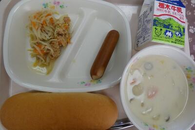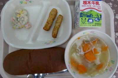 今日の給食は、フランクフルト、もやしのカレードレッシングあえ、秋のシチュー、コッペパン、牛乳でした。エネルギー656kcal、たんぱく質24.8g、脂質24.9gでした。ごちそうさまでした。