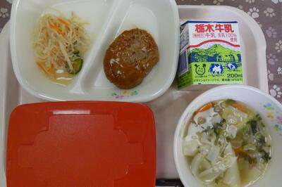 今日の給食は、酢豚風ハンバーグ、とり肉と春雨の中華あえ、ひらひらワンタンスープ、ごはん、牛乳でした。エネルギー626kcal、たんぱく質22.6g、脂質16.4gでした。ごちそうさまでした。