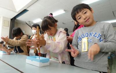 作り終えた子供たちは、「わくわくカード」にコマをスケッチして、その後コマを回して遊びました。