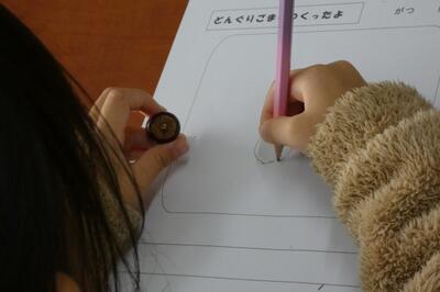 これは、キリを使ってドングリにグリグリと穴をあけているところです。