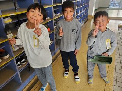 休み時間にクラスの靴箱掃除をしている1年生です。ごくろうさまです! きれいになりますね~。