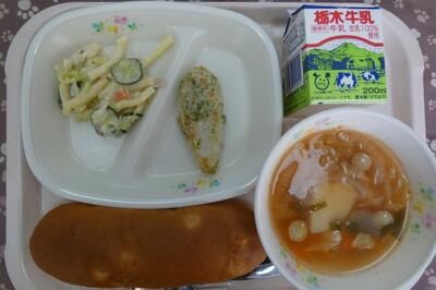 今日の給食は、あらびきチキンナ、ビーンズサラダ、アルファベットスープ、黒糖コッペパン、牛乳でした。エネルギー671kcal、たんぱく質26.9g、脂質28.9gでした。ごちそうさまでした。