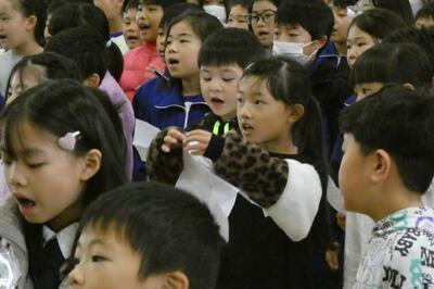 式典の中で記念に歌う「世界がひとつになるまで」(松井五郎 作詞、馬飼野康二 作曲)を、初めて全校児童で合わせてみます。どうなるのか、ドキドキワクワクです。