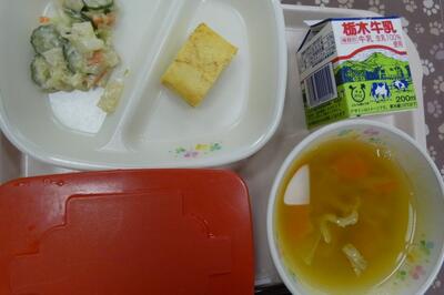 今日10月31日は、ハロウィーン給食でした。厚焼きたまご、かんぴょうサラダ、かぼちゃ入りみそ汁、ごはん、牛乳をいただきました。エネルギー600kcal、たんぱく質21.5g、脂質20.5gでした。ごちそうさまでした。