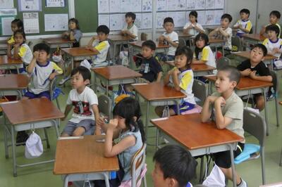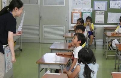 高学年の子たちが、クイズの答え方や用紙の使い方を、1年生に優しく教えていました。