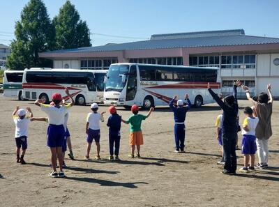 午前8時ちょうどに、5年生が臨海自然教室のために茨城県鉾田市へと出発しました。