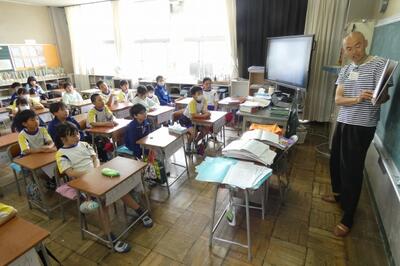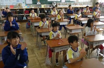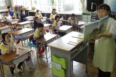 教科書にある物語「とん こと とん」を先生の後に続いてみんなで読み、次に子供たちだけで読んでいました。担任の先生が「上手になってきましたね!」と褒めていました。
