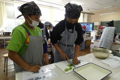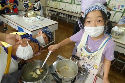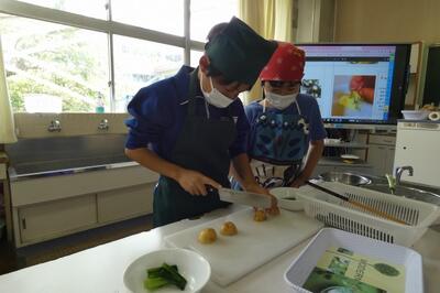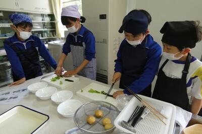 5年3組の家庭科授業におジャマしました。初めての調理実習の今日は、青菜のおひたしと茹で芋を作りました。