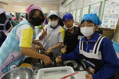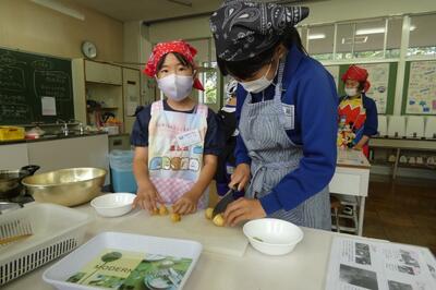 子供たちは、丸いイモが転がらないように注意して切っていました。